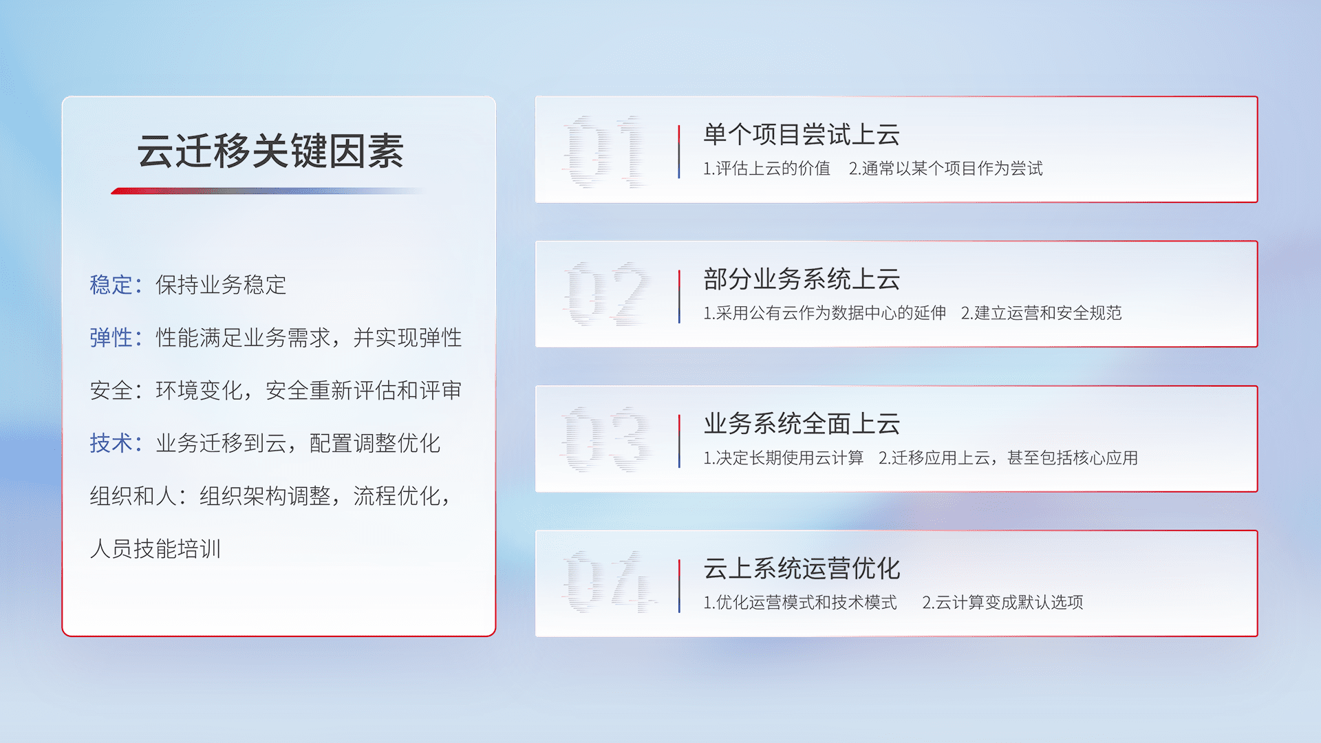 结合实际业务,,从规划设计、、云平台选型、、、云原生改造、、数据迁移、、集成交付,,,,迁移全过程为客户识别最佳上云路径,,,,做好风险识别管理,,设计网络架构、、身份权限、、安全审计合规、、、操作审计、、日志审计、、监控告警策略、、、、多站点容灾设计等,,对云上基础设施进行整体规划,,,提升IT治理水平,,,,以满足弹性、、高可用、、、、高性能的需求。。。。