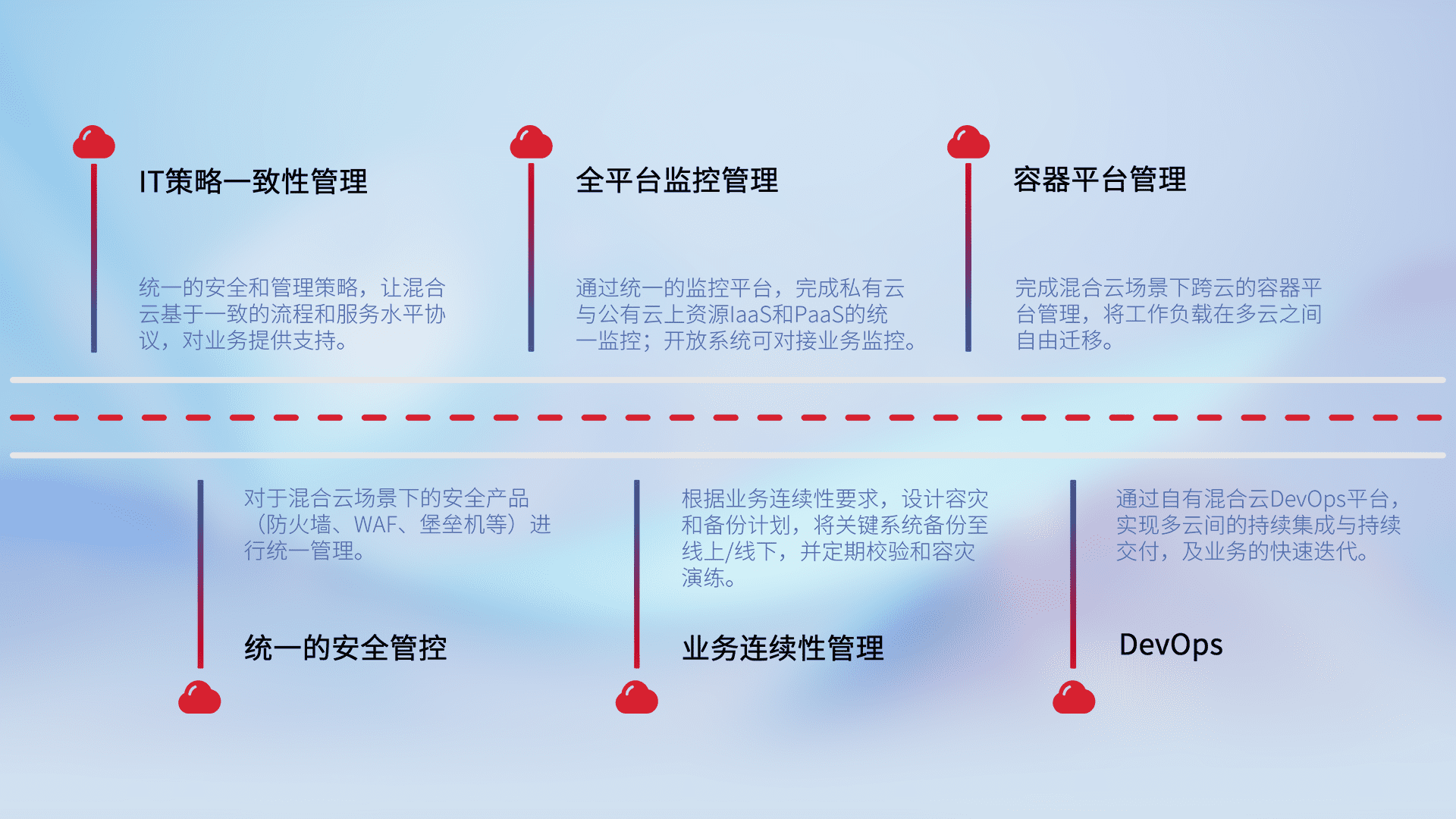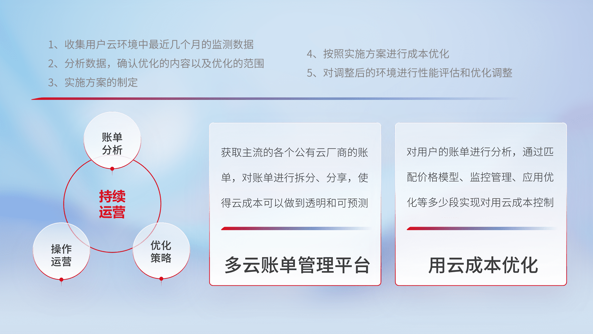 通过多云纳管,,,以统一的资源数据模型把客户的云资源进行抽象和封装,,进而实现对多云资源的统一操作,,保障云资源管理的可靠性、、稳定性与可用性。。量身定制化运维内容,,,配置、、、开发运维、、、补丁管理、、、、备份、、、监控、、、、认证和访问管理、、审计和日常巡检等,,,保障在用云过程中的可靠度,,,稳定度以及高可用率。。。。