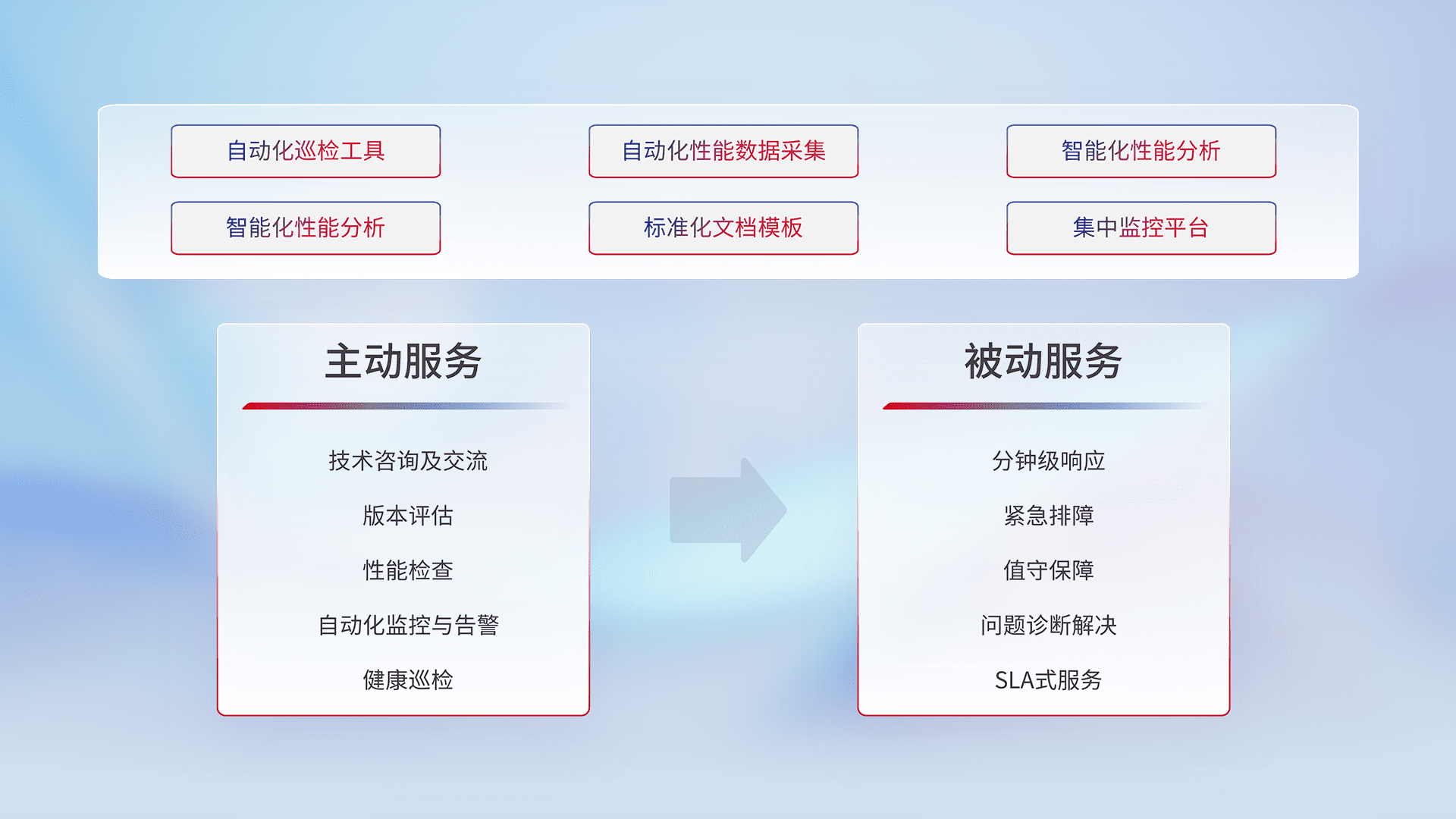 智能化工具和标准化文档,,保障服务质量,,,,提供主动服务(包含技术咨询、、、、版本评估、、、性能检查、、、自动化监控与告警、、健康巡检)和被动服务包含(分钟级响应、、、、紧急排障、、、、值守保障、、、问题诊断解决、、、、SLA服务)。。